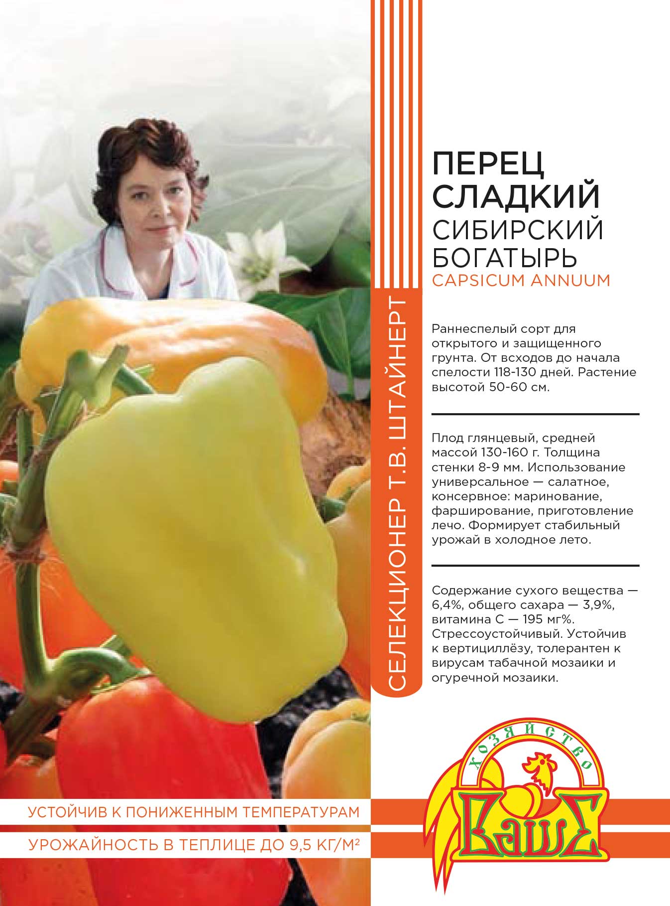 Очень ароматные, вкусные и сочные плоды. Среднеспелый сорт. Для открытого грунта и пленочных теплиц. Период от всходов до начала созревания 110-120 дней. Растение среднерослое. Плод призмовидной формы, глянцевый, в технической спелости зеленый, в биологической - оранжевый. Масса плода 140-160 г, толщина стенки 5,8-6,2 мм. Вкус отличный. Толстостенные, сочные, ароматные плоды очень вкусны как в свежем виде, так и в блюдах с легкой термической обработкой и в зимних заготовках.
